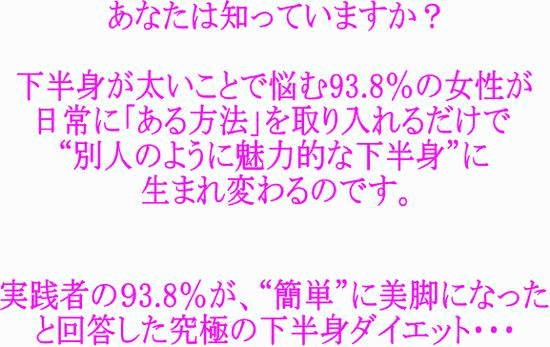 わたしを紹介して欲しいといわれ、出来る限り教えていたのですが、 あまりにも多くの女性が同じ悩みを持ち 雑誌やエステのダイエット法を全て信じて、中々成果が出ず 大金を払ったりリバウンドを繰り返していたりするのを痛感し、 このあるダイエット法の公開を決心したのです。 |