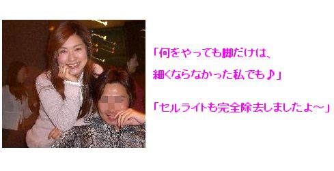 1ヶ月で・・・ 「ウエスト−3.7cm!」 今まで何をやっても足だけは全然細くならなかったのが しかも、セルライトまで消えていって・・・